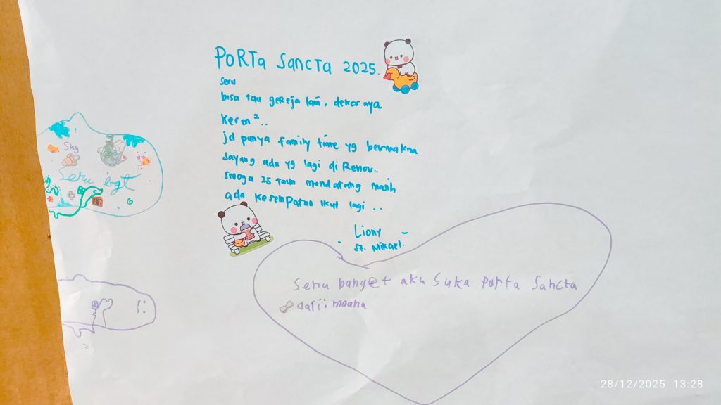Rangkaian kegiatan diawali dengan Perayaan Ekaristi pukul 08.00 WIB dipimpin oleh Pastor RD. Antonius Dwi Haryanto yang diikuti oleh umat paroki dengan mengenakan baju Porta Sancta dari masing-masing lingkungan, wilayah ataupun masing-masing kelompok kategorial. Misa berlangsung khidmat namun penuh kegembiraan, ditandai dengan arak-arakan empat karakter Luce, Fe, Xin, Sky yang mengiringi perayaan dan menghadirkan suasana yang ramah, terutama bagi anak-anak dan keluarga muda.